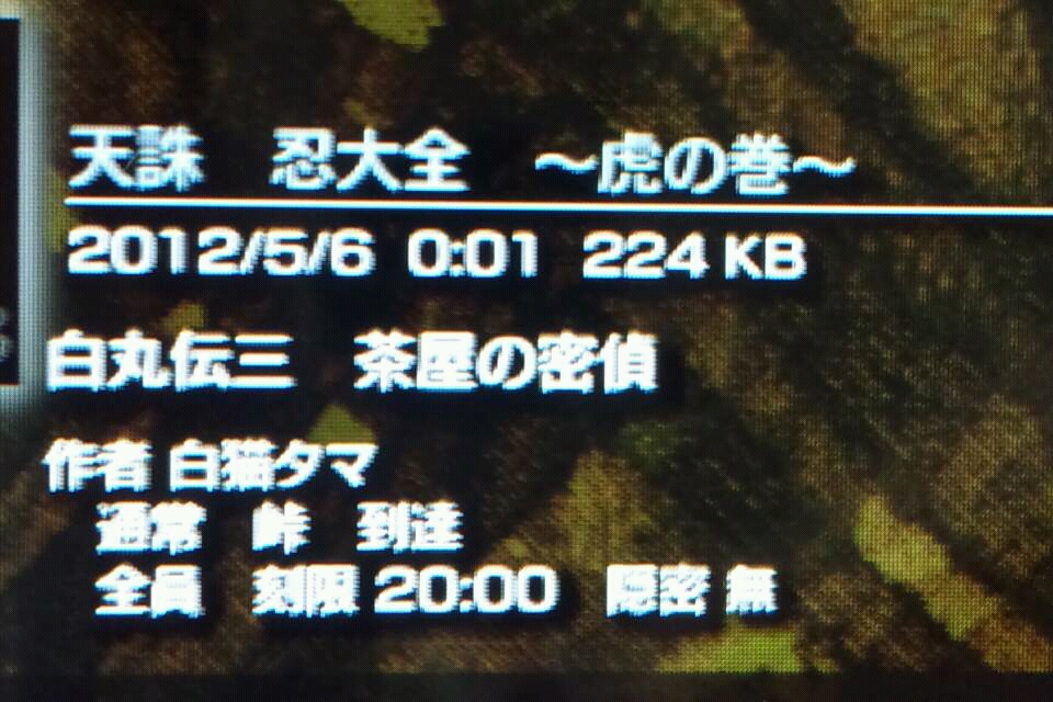 白猫タマさん『白丸伝三 茶屋の密偵』プレイ後記 前回記事 白猫タマさん『白丸伝二 上忍達の洞窟』プレイ後記この記事は任務についてのネタバレを含みますので、未プレイの方はご注意を。大丈夫な方は続きへどうぞ。 『白丸伝三 茶屋の密偵』演出面:敵の集団は、なかなか曲者揃いのようです。↓証拠写真どう考えても只者ではありませんw頭の男も、始末屋町人のくせに無駄にいろんな音を出しますwそれは冗談として、今回、文書に記された妖怪の正体が明らかになりました。名前は『羅刹鬼門(らさつきもん)』。かつて日の本の大半を焼いた異界からの侵略者だそうです。それを封印するための『星宿殿』と、さらに『四神寺』。今後の展開の鍵となりそうな名前が大挙して登場。なんとなく物語の全容が見えてきたという感じです。さて、そんな危険な化け物を、敵は本当に解放してしまうつもりなのでしょうか。そのつもりだとしたら、一体なんのために……?任務面:前回ほどではありませんが、偽床や奈落が意表を突いて表れ、ヒヤヒヤさせてくれます。また、水場が多く、敵の持っている爆弾や煙玉と相まって青殺状態になりやすいです。大将は中途半端なところにいたので、初回プレイでは勢い余って忍殺してしまいました。しかし、なんと言っても特筆すべきは到達目標の場所。『勇気を振り絞る』ってそういう意味ですか……。私は偶然、ギリギリのところで死なずに済みましたが、あたりの穴を選んでも花陰のいる足場以外は奈落という徹底ぶり……。一回目のプレイでは、敵を全滅させたあと、うっかりすでに踏み落としていた偽床に嵌って死亡。げんなり。もはや完全に恒例行事となりつつあります。二回目のプレイ、ゴール直前の敵の爆死で瀕死状態になりつつも、全忍殺を取ってクリア。『プロローグ編』全体を通して、理不尽な偽床に苦しめられました。これは白猫タマさんの性格が『ドS』ということに起因していることでしょうw物語の方は、ここまでを見る限り王道の筋というべきでしょうか。次回からの展開に期待させていただきましょう。 PR